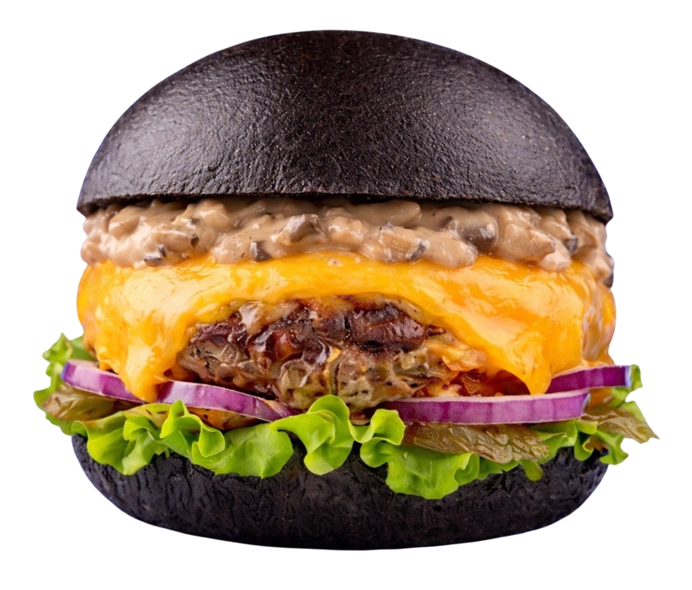 Ароматный бургер с фирменной черной булочкой, жареными грибами с луком в соусе демиглас, сочной котлетой из мраморной говядины Блэк Ангус, свежими листьями салата и помидорами, маринованными огурцами и свежим красным луком, заправляется фирменным соусом с трюфельным маслом.