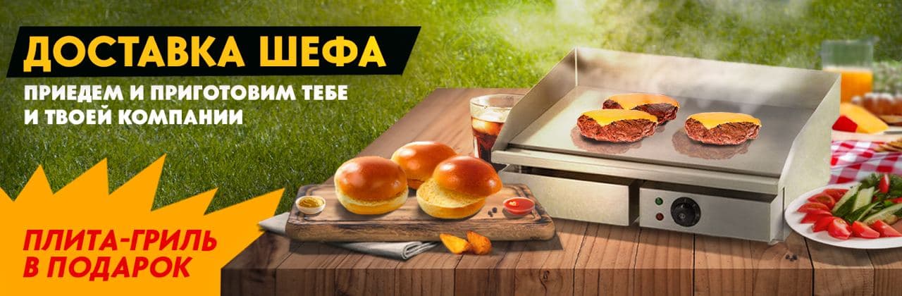 В Black Star Burger появилась новая услуга — доставка шефа! Теперь вы можете заказать не только бургеры или шеф-наборы для их приготовления, но и самого шефа, который приготовит при вас СОЧЧНЫЕ МОЩЩНЫЕ бургеры, пока вы отдыхаете с семьёй или друзьями, а ещё оставит в подарок гриль-плиту!